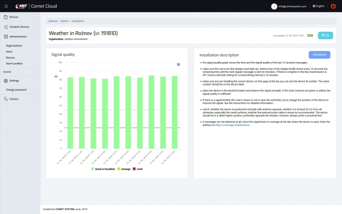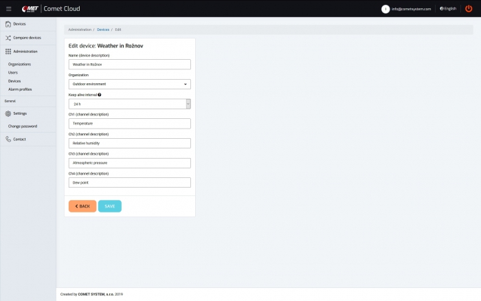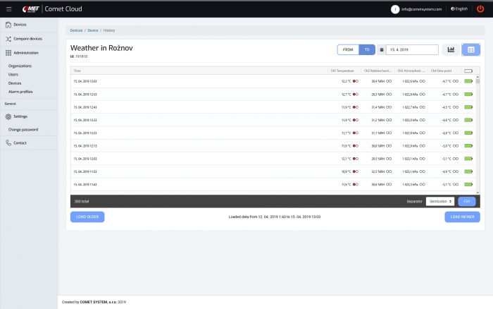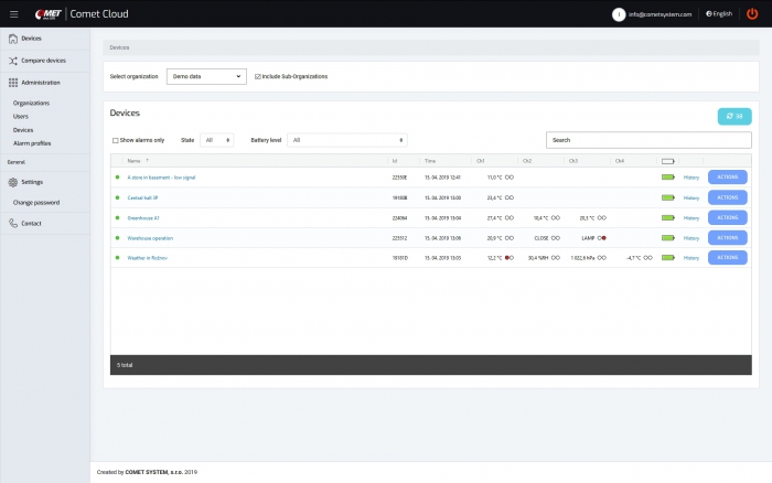 After purchasing a device that supports connection to the COMET Cloud, you can register the device in the COMET Cloud. Each user has access only to their account, which is password protected. If you run a large number of devices in the COMET Cloud, you can clearly organize them into groups and assign new users to them, who can have an overview of the group of devices. Different rights for data display and administration can be set for individual users.
