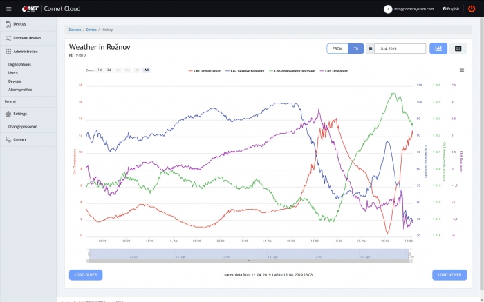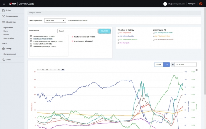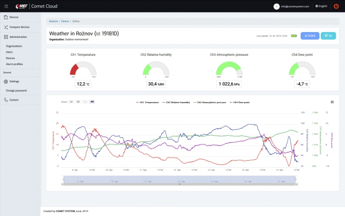 COMET Cloud is an Internet data storage designed for recording measured values from selected COMET measuring instruments. The data is accessible after the user's connection to the Internet and is displayed in a web browser in the form of a table or graph. Users can be notified by e-mail of all alarm conditions reported by the device.