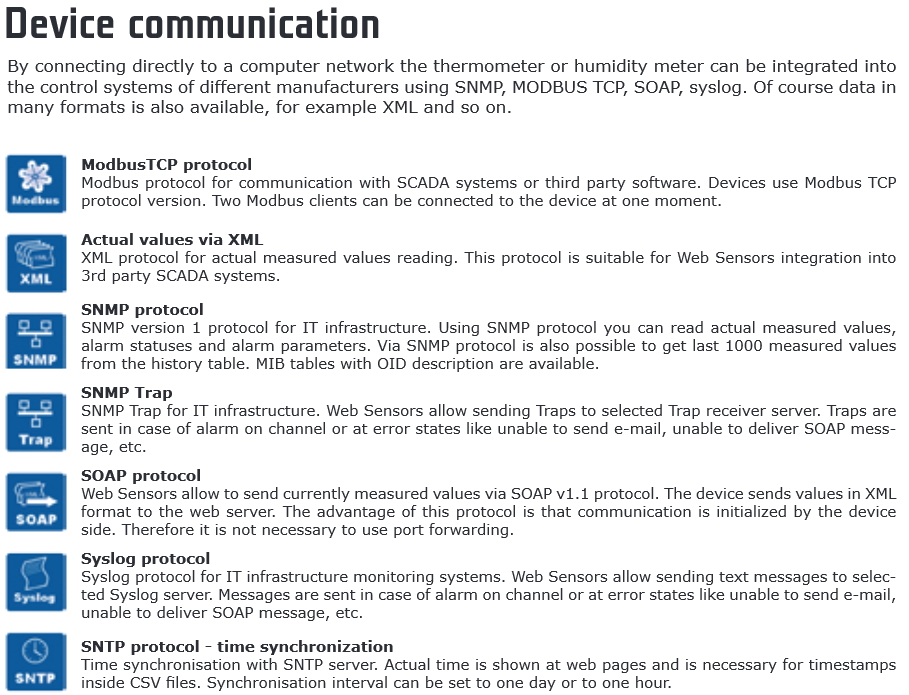 Communication protocol WWW, ModbusTCP, SNMPv1, SOAP, XML