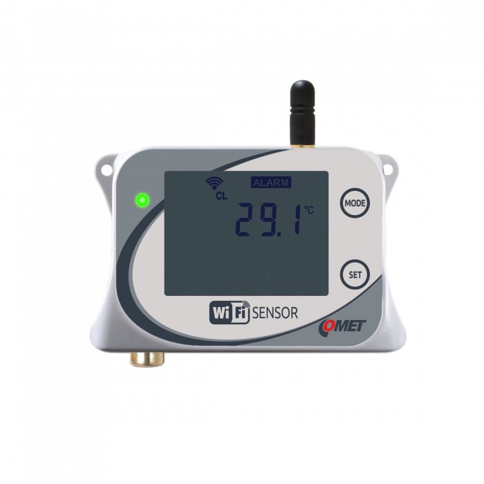 Communication with the sensor is done via a wireless WiFi network. The device allows sending measured values to the online COMET Cloud (with the shortest interval of 5 minutes) or into COMET Database. The values can be displayed on integrated web pages and provided to third party systems using the Modbus TCP, SNMP, JSON and XML. The measured values are displayed on the LCD display.